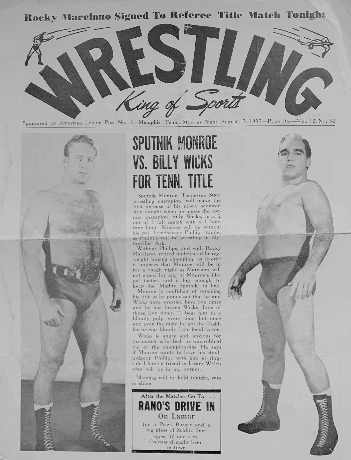Monday 17 August 1959 is the poster that still hums. Sputnik Monroe vs Billy Wicks for the Tennessee title at Russwood Park, with Rocky Marciano in a striped shirt and a Cadillac in the copy. Russwood sat around fourteen thousand for a ballgame. That night the fences did not hold. People poured over outfield rails and blinked into floodlights. You can still find the programme, ink that promises morals while admitting what it really sells: