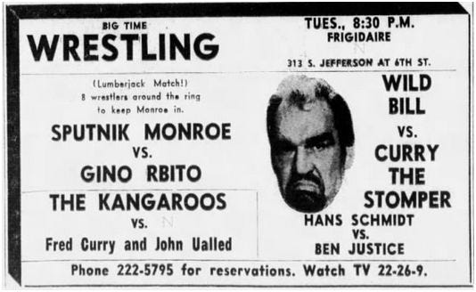 Dayton, Feb–Mar 1970, Frigidaire Union Hall (Local 801, 313 S. Jefferson). Four straight Tuesdays topped by Sputnik vs Fred Curry or Gino Brito. The ad copy in bold caps: No stopping on account of blood. Texas Death Match. Prices set out like an affidavit: Ringside $3.50, General $2.50, Kids half-price. Low rafters, hot room, cigarettes and whistles from the back row. You don’t run four consecutive union-hall tops unless the mouth is bringing them back to see if someone finally shuts him up.