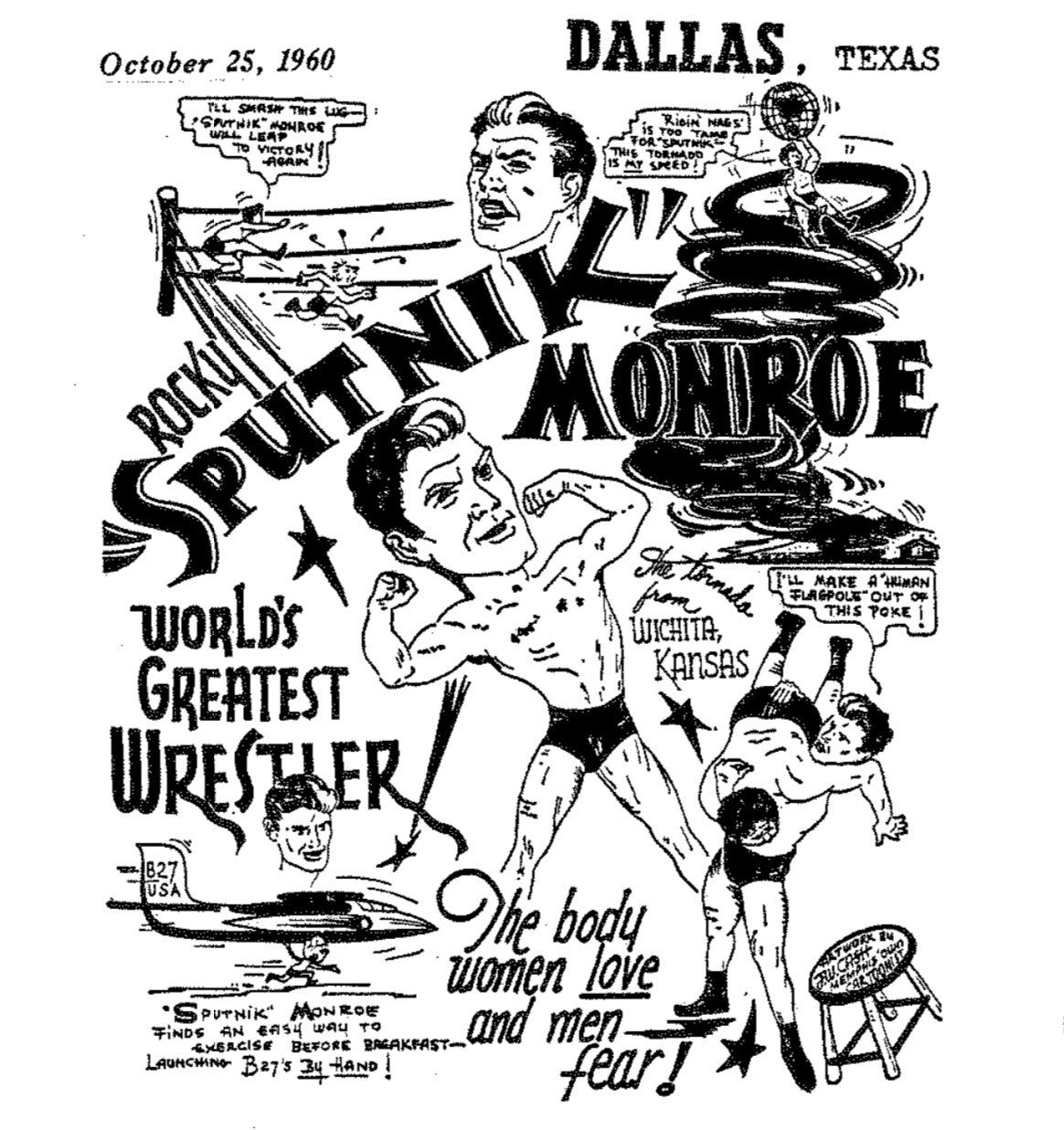 Dallas, 25 October 1950. A cartoon broadside with a grinning heel in a tornado, speech bubbles everywhere and, across the bottom in bigger type than the opponents, the catchphrase. The act sold in Memphis. It sold in Texas. It sold wherever the aeroplane took him. If you’re a novelty, you don’t get the poster’s bottom strip to yourself.