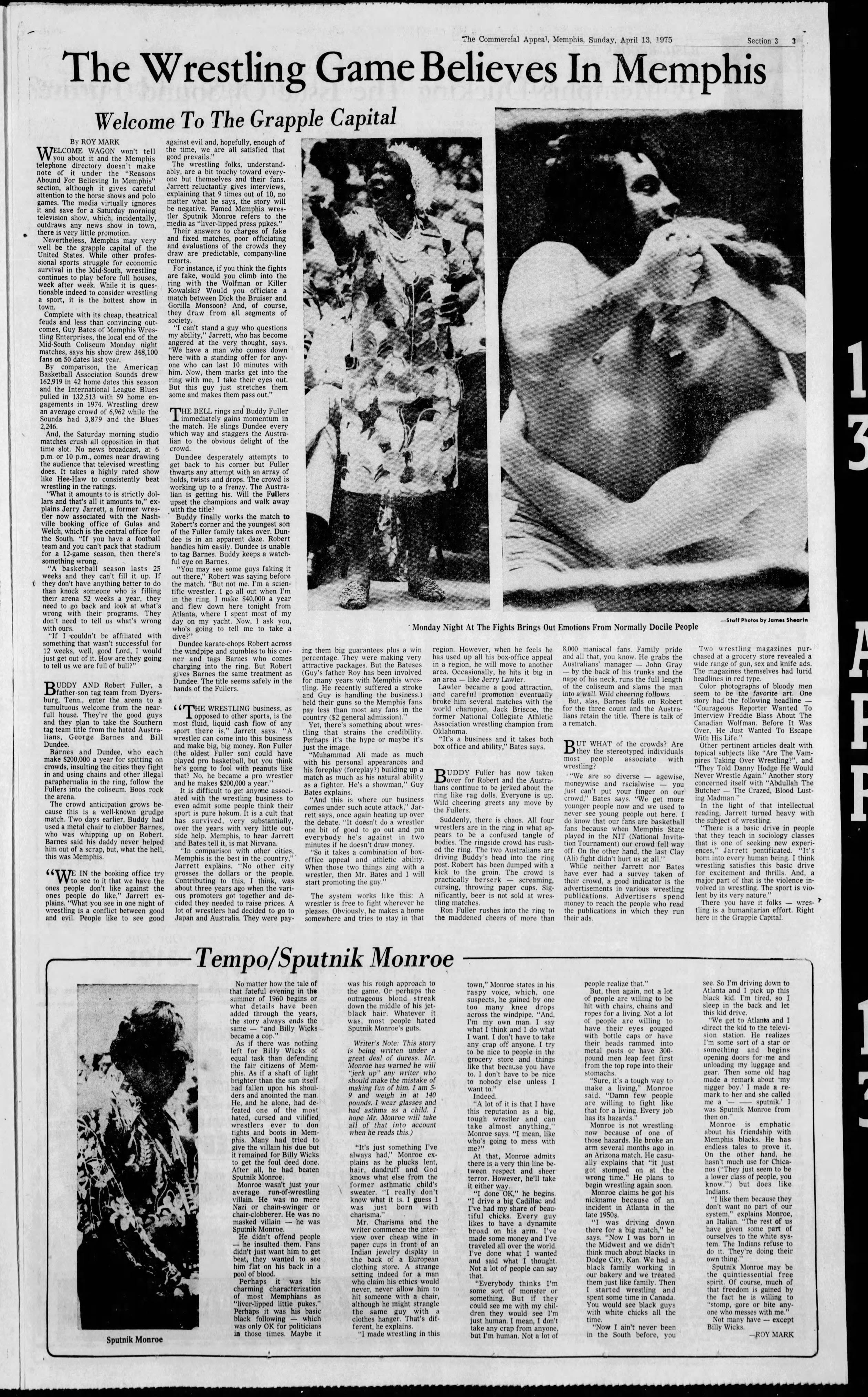 – 13 Apr 1975, Commercial Appeal. Full Sunday page: “The Wrestling Game Believes in Memphis.” Boxed “Tempo/Sputnik Monroe.”