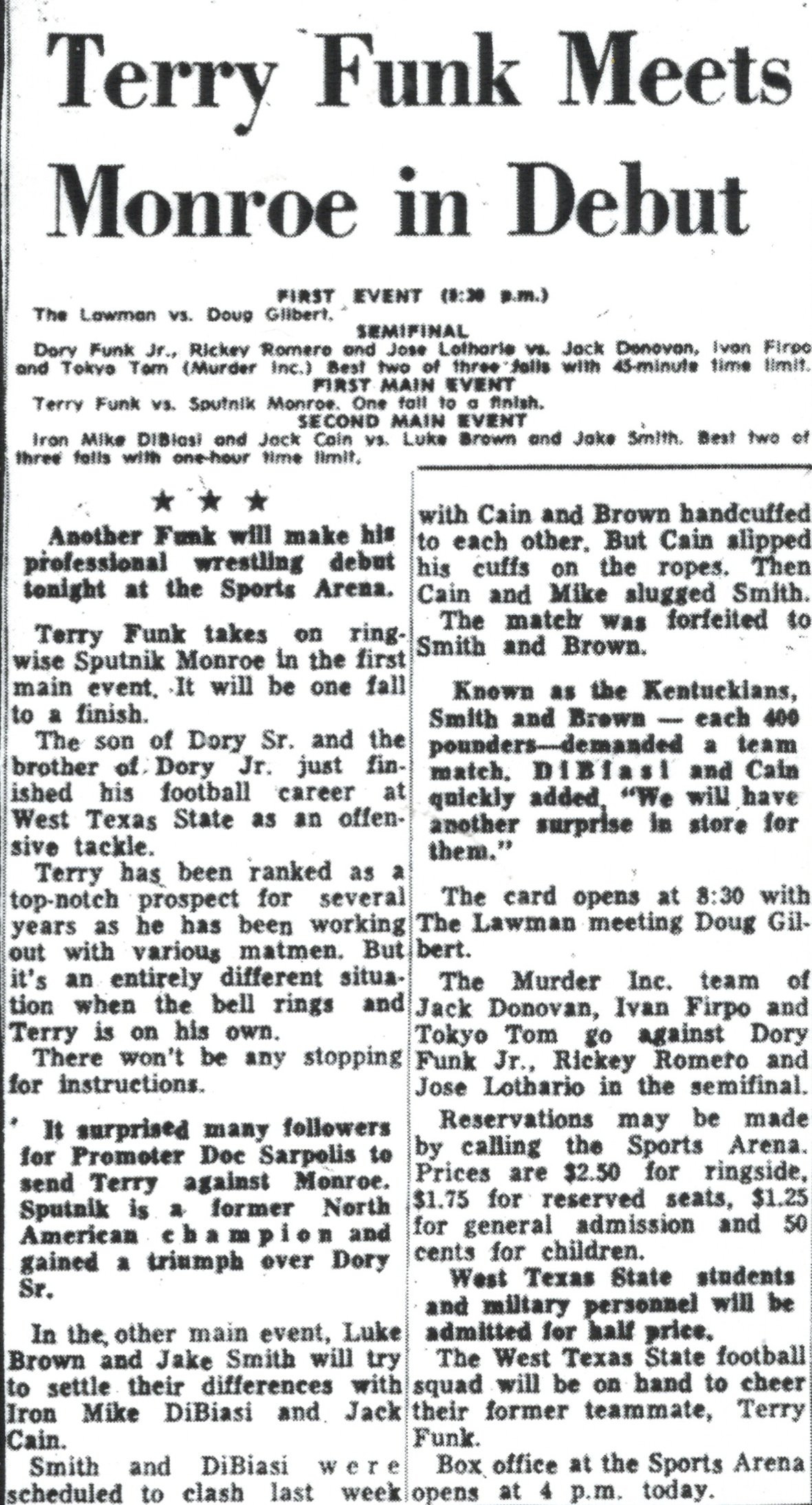 – 9 Dec 1965, Amarillo. Terry Funk’s debut vs Monroe; prices itemised; office trust.